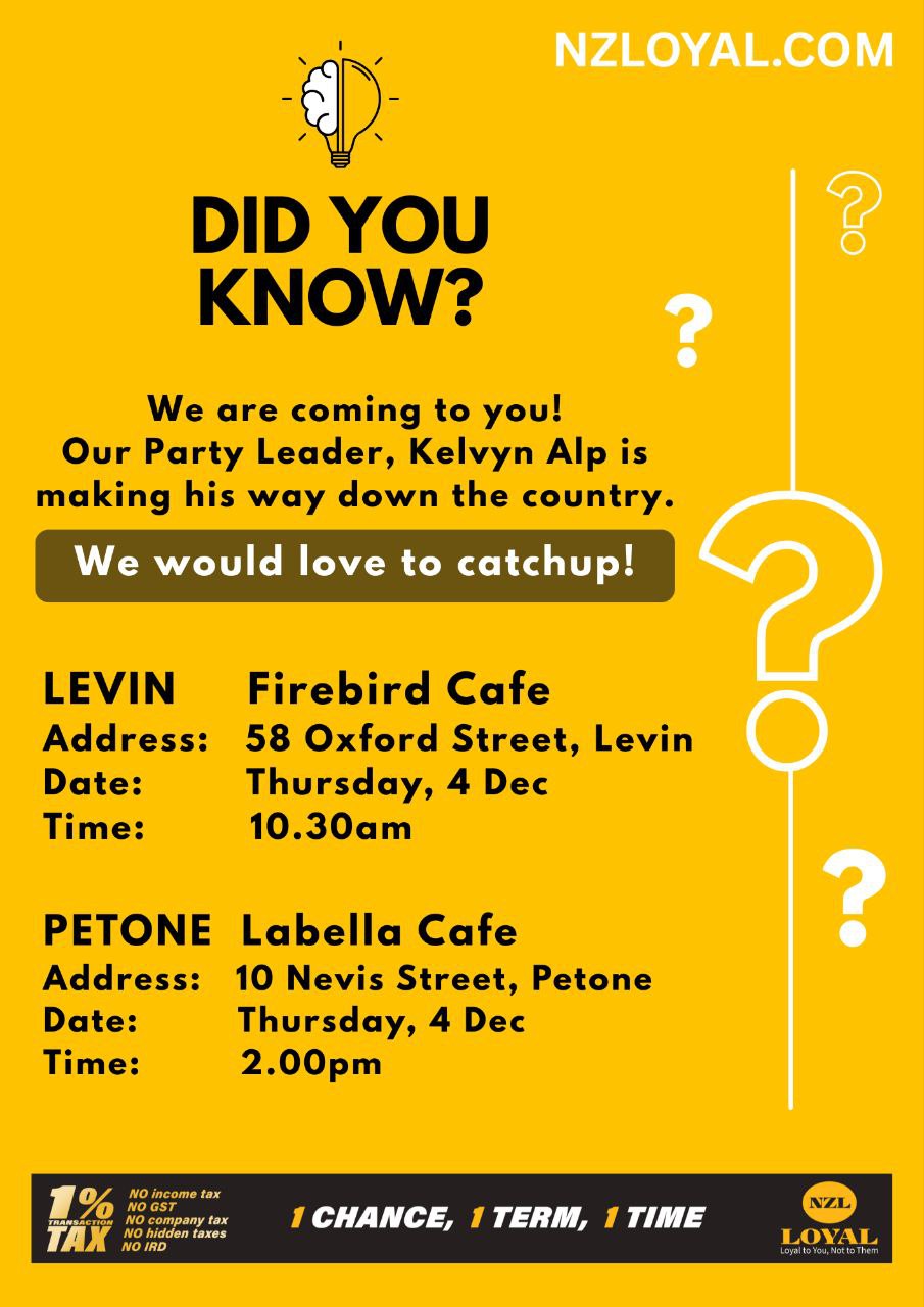 We are coming to you! Starting December 3rd. Our Party Leader Kelvyn Alp is making his way down the country and is enthusiastic to connect with you and hear your concerns, have a chat about our policies and NZ Loyal’s focus forging ahead to contest the 2026 Election.